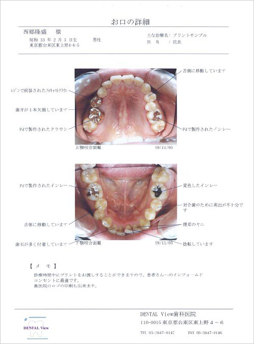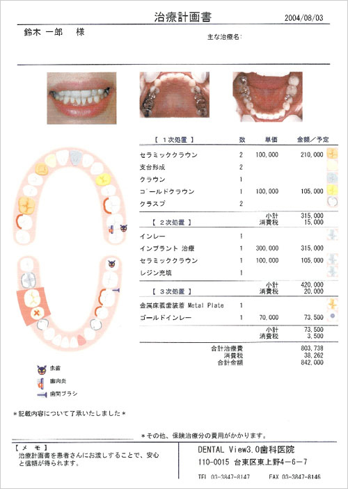 治療の方針を明確にし、治療費のお見積もりも提示できます。 症状にあわせて、咬合面イメージと正面側方面イメージを選択できます。